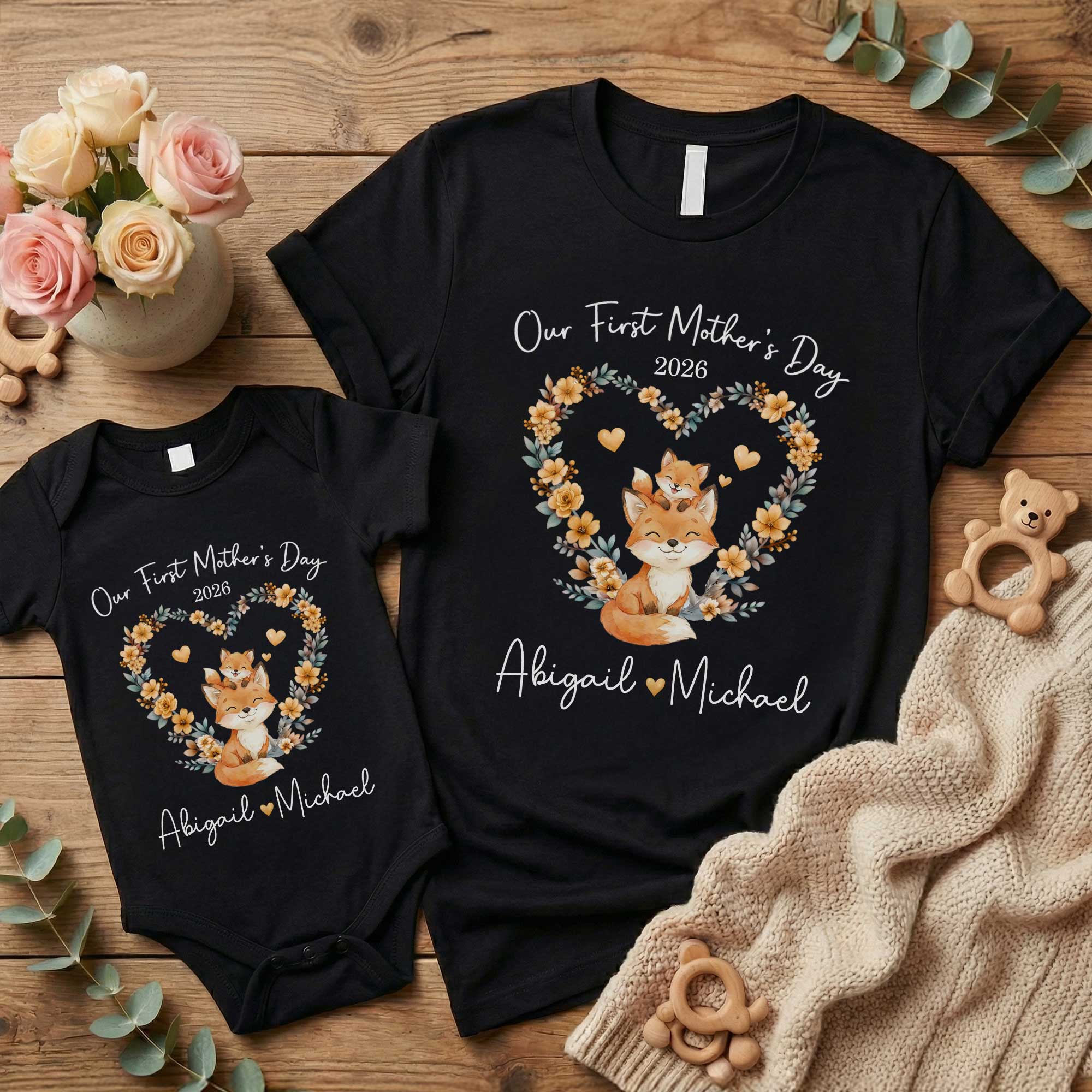 Personalized Details - Both the mom T-shirt and the baby bodysuit can include custom names and a chosen year, adding a meaningful personal element. The printed details create a keepsake piece that marks a memorable first Mother’s Day.
