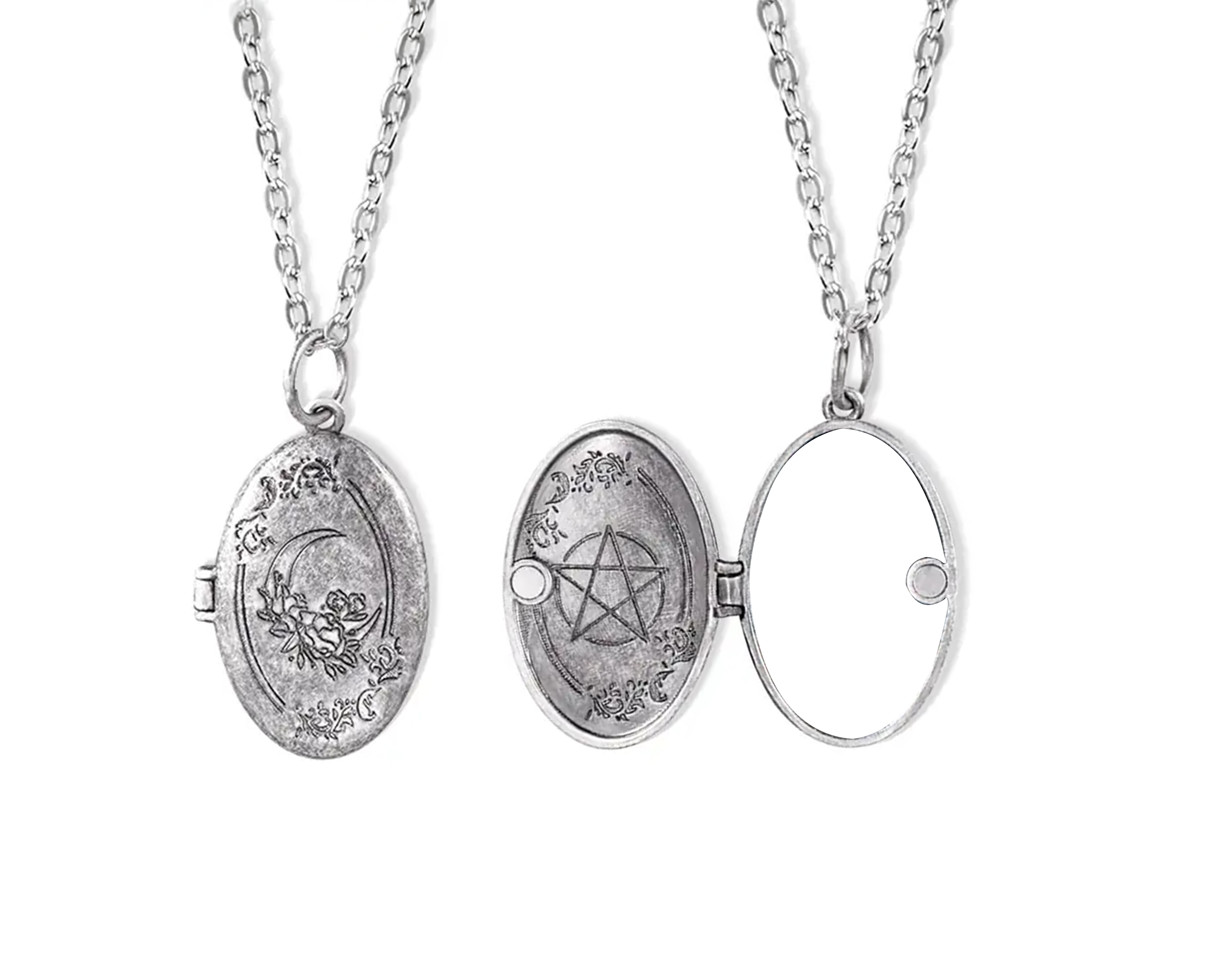 Vintage Style - The locket features a Wiccan pentagram design with a broom closet and moon, perfect for any witch lover. the locket has an antique, vintage style that adds charm and appeal. The locket is made of high quality brass to ensure its durability and longevity.